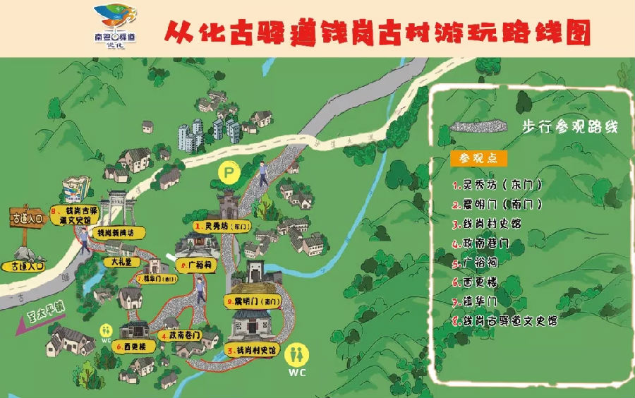 ◆路线1:灵秀坊、震明门、钱岗村史馆、政南巷、广裕祠、西更楼、镇华门、钱岗古驿道文史馆等。