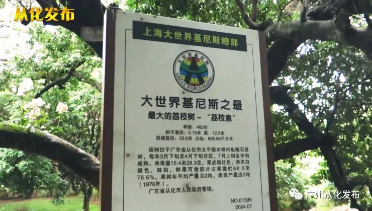 它在2004年7月获上海大世界基尼斯总部颁发的大世界基尼斯之最证书。证书上载:最大的荔枝树——“荔枝皇”,树龄400多年,树干基径5.15米,树高12.5米,冠幅直径33.6米,占地886.66平方米。